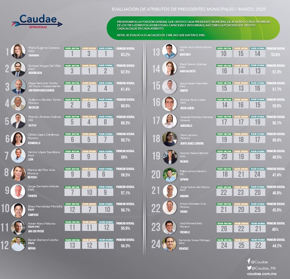 Los primeros tres lugares son ocupados por la alcaldesa panista de Chihuahua, María Eugenia Campos; seguida de Enrique Vargas del Villar, alcalde panista de Huixquilucan, Estado de México; y el independiente Miguel Bernardo Treviño del municipio más rico de todo el país: San Pedro Garza García.