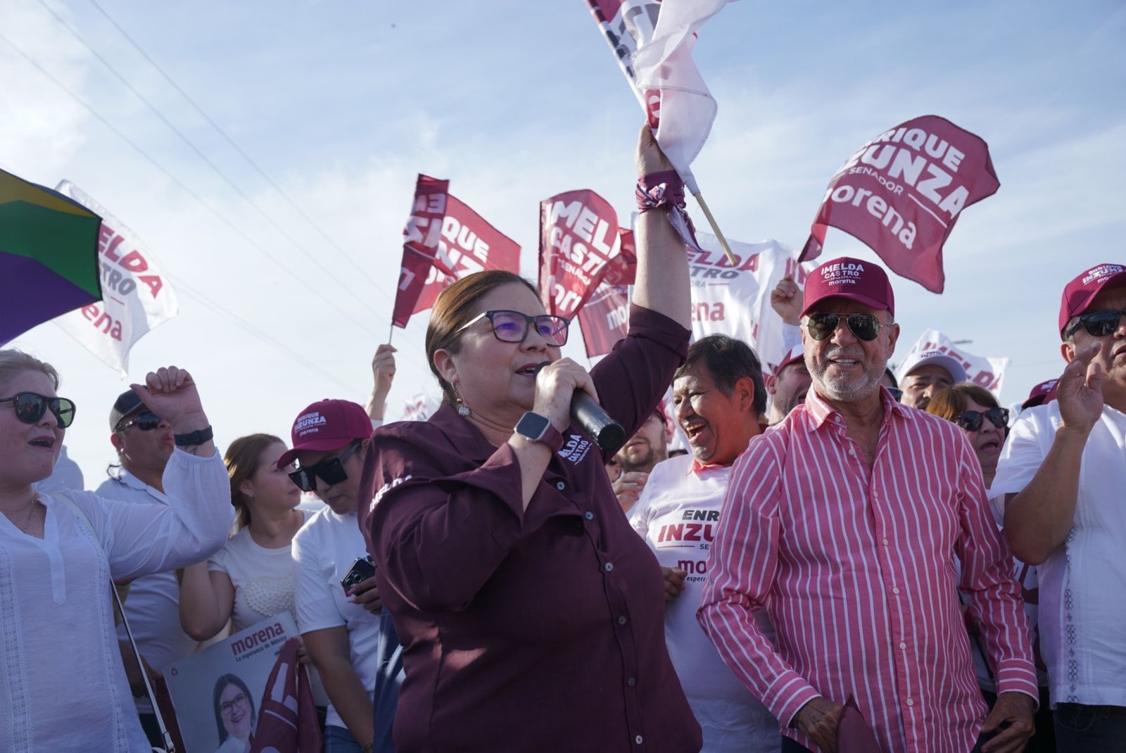 Imelda Castro, candidata en primera fórmula, dirigió unas palabras a los congregados en el área conocida como Ampliación Malecón Nuevo: “Muy buenas tardes, maestras y maestros, les agradecemos mucho su presencia esta tarde. Estamos viviendo un momento estelar en la vida pública de México. Sin las maestras y sin los maestros no hay Cuarta Transformación”, aseguró con emoción.