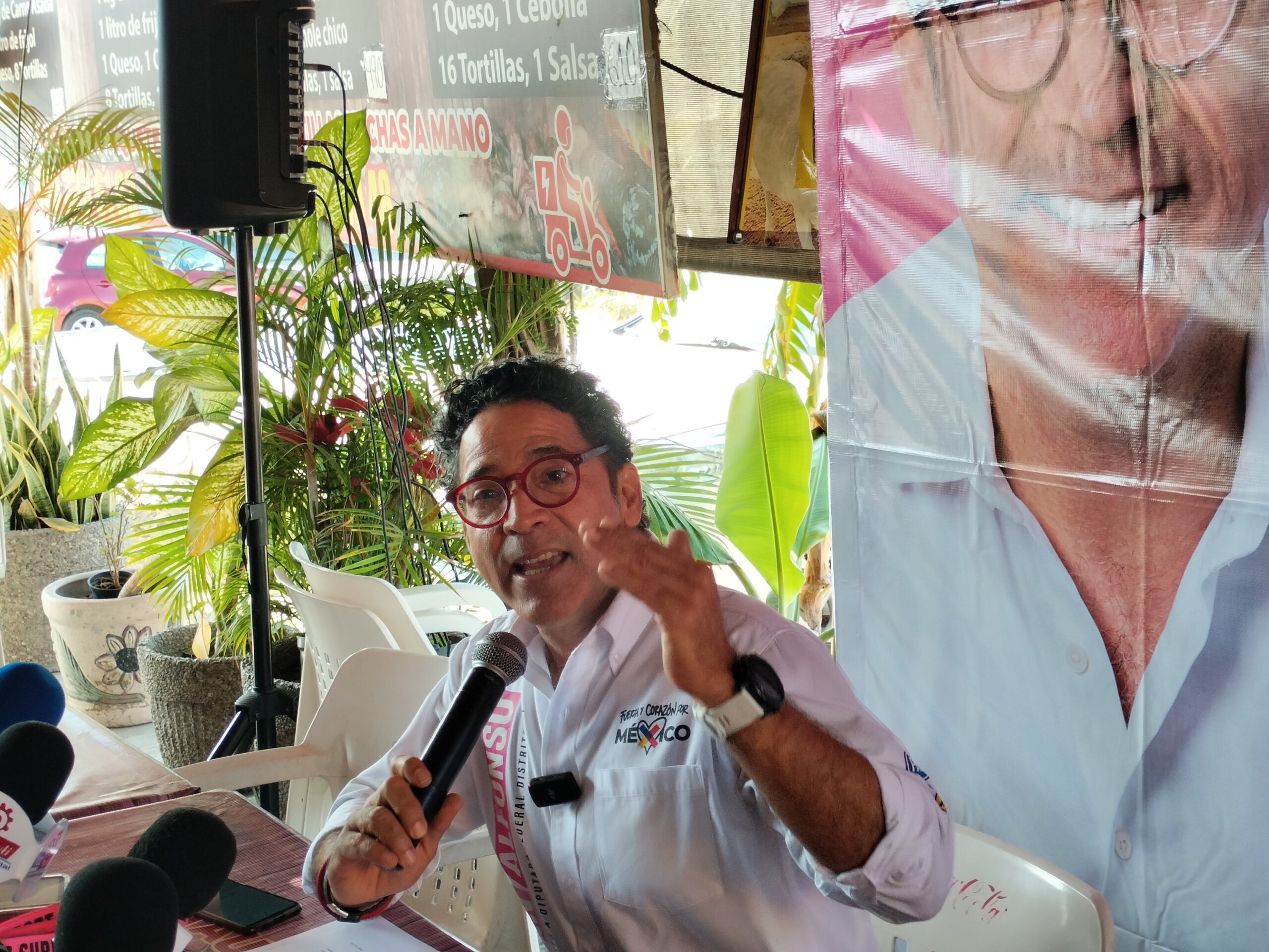 En este encuentro con periodistas, Juan Alfonso Mejía comenzó mencionando que sigue en pie la petición de que el INE realice un debate entre los candidatos de su distrito, para que los votantes conozcan la forma de pensar de cada uno: “si no tienen donde hacerlo, nosotros mismos lo buscamos. Ya se mandó la petición, esperemos que contesten pronto”.