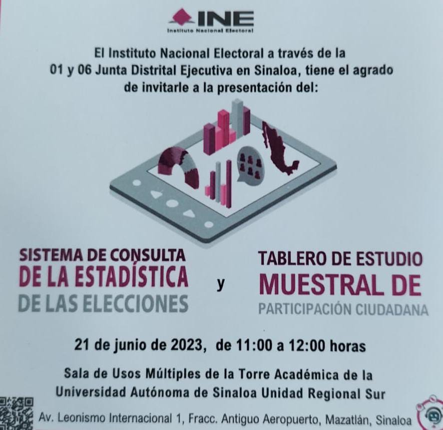 En este tenor, el INE en Sinaloa a través de las Juntas Distritales Ejecutivas 01 y 06, llevarán a cabo la presentación del Sistema de Consulta de la Estadística de las Elecciones (SICEE), que integra la Estadística Electoral Nacional con los resultados de las elecciones federales, a partir del año 1991 hasta 2021, y locales, desde 2015 hasta 2022, el cual puede ser consultado en el siguiente enlace: https://siceen21.ine.mx/.