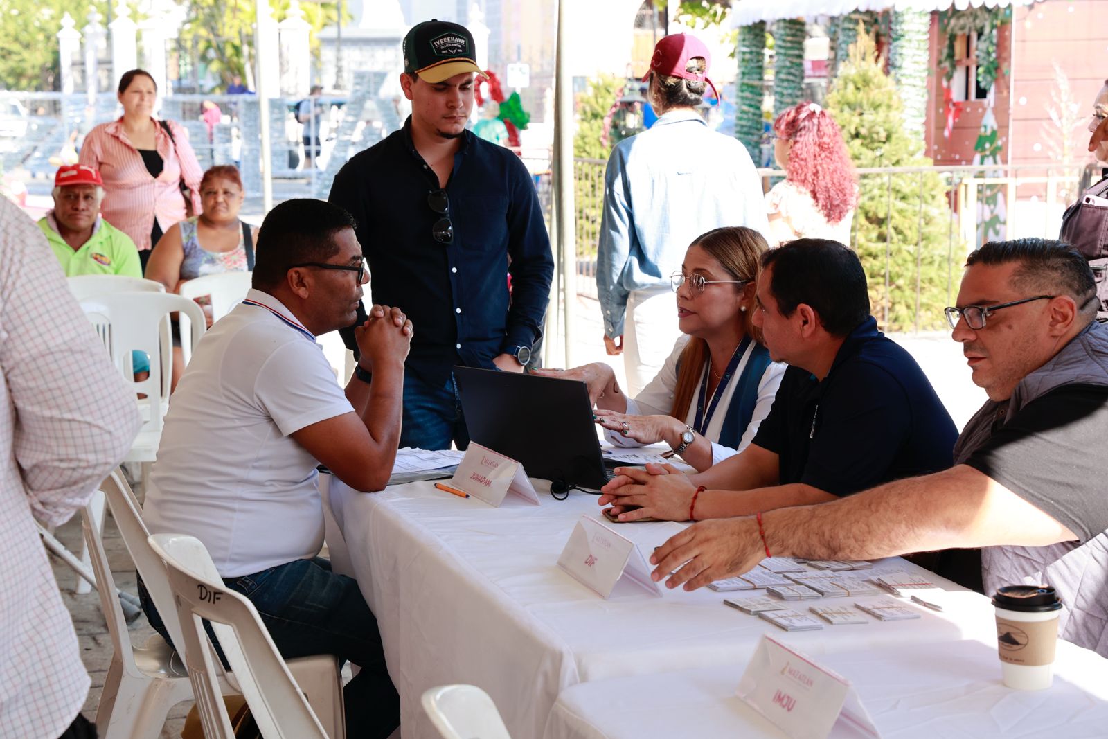 JUMAPAM dio apoyo y orientación para facilitar sus trámites a todos los usuarios atendidos este martes durante la última audiencia pública del año del programa “Contigo Mazatlán”, realizada en la Plazuela República, por iniciativa del Gobierno de la Presidenta Estrella Palacios Domínguez.