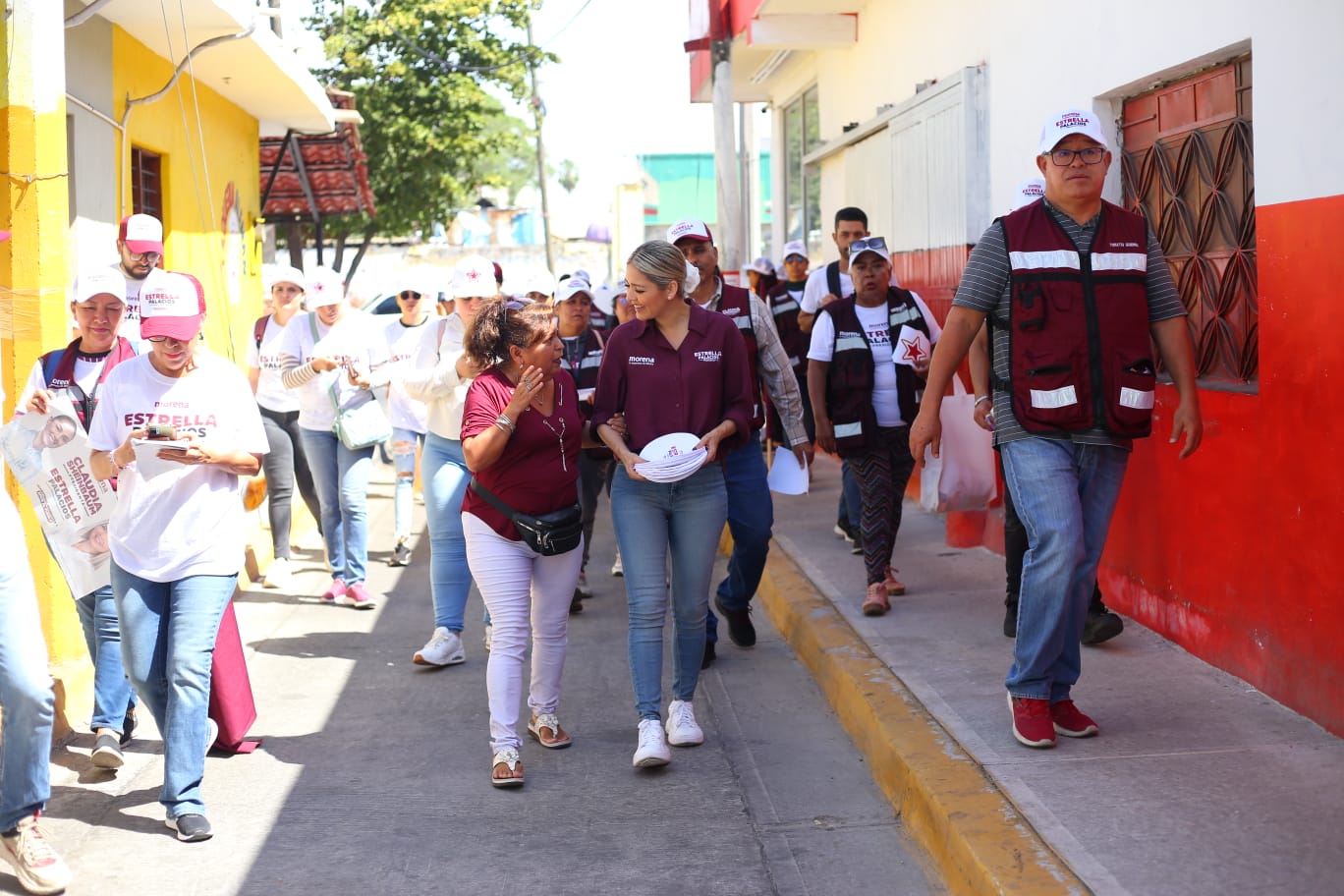 Antes de llegar al escenario Estrella Palacios se abrió paso entre la muchedumbre y ante los gritos de entusiasmo de quienes la acompañaron al inicio de su campaña, se detuvo en varias ocasiones para abrazar y recibir porras y el cariño de la gente.