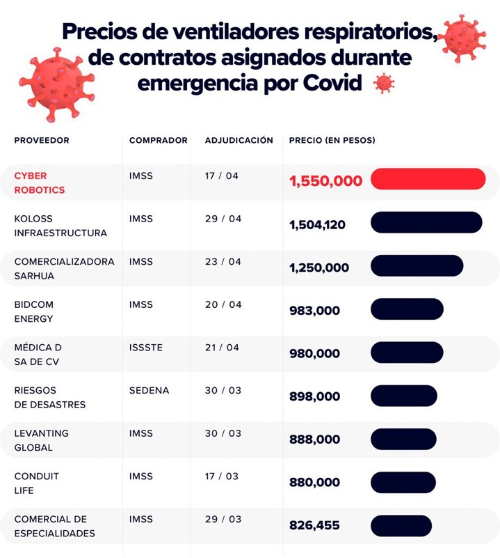 En la revisión de contratos de “equipo electromecánico controlado por microprocesador, de soporte de vida para apoyo ventilatorio en pacientes que tienen comprometida la función respiratoria”, Mexicanos contra la Corrupción detectó una diferencia del 85 por ciento en el precio más barato y el de la compañía de León Manuel Bartlett Álvarez.