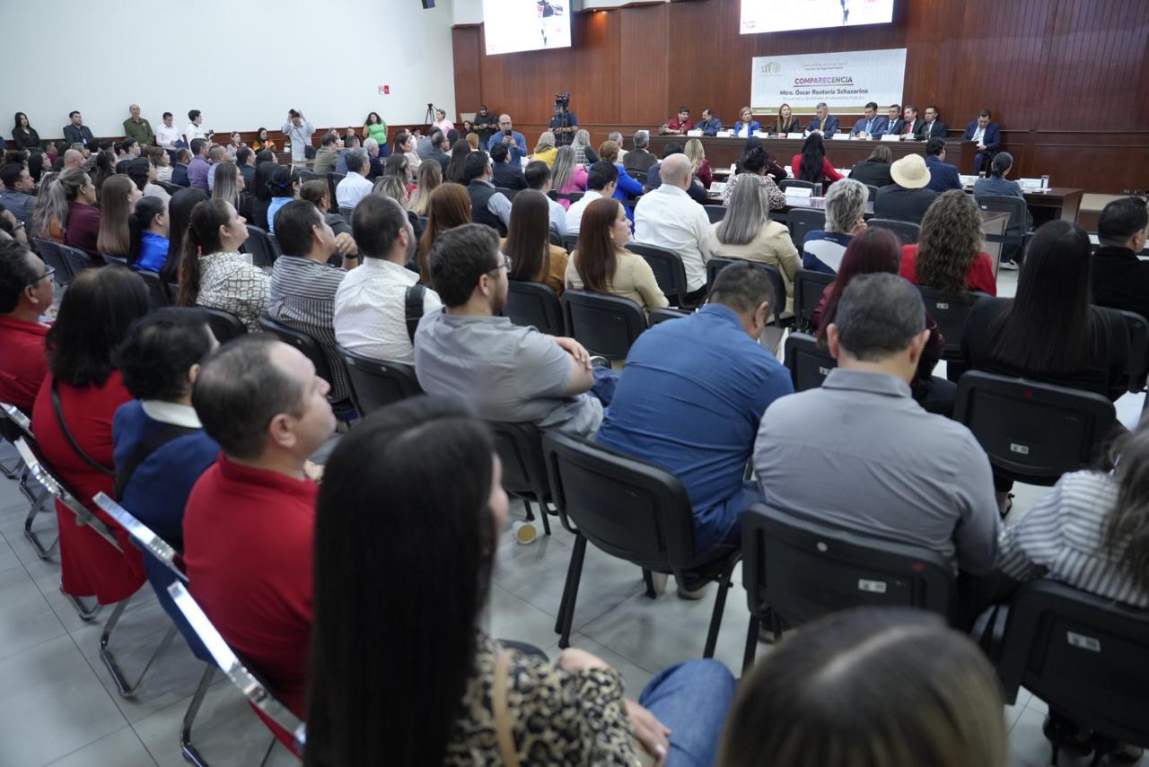 El Secretario de Seguridad Pública del Estado de Sinaloa, Óscar Rentería Schazarino, compareció este miércoles 21 de enero ante las y los integrantes de la 65 Legislatura para rendir cuentas sobre los resultados del Cuarto Año de Gobierno en materia de seguridad pública, en un ejercicio que forma parte de la Glosa del Cuarto Informe del gobernador Rubén Rocha Moya.