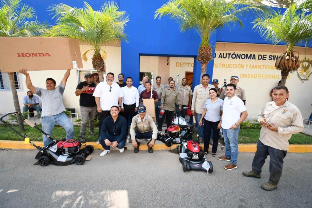 Gracias a las gestiones de Vicerrectoría en la Unidad Regional Sur (URS) y con el apoyo del Rector de la Universidad Autónoma de Sinaloa (UAS), Dr. Jesús Madueña Molina, se hizo entrega de equipo de trabajo al personal de mantenimiento en el área de jardinería, perteneciente al campus universitario.